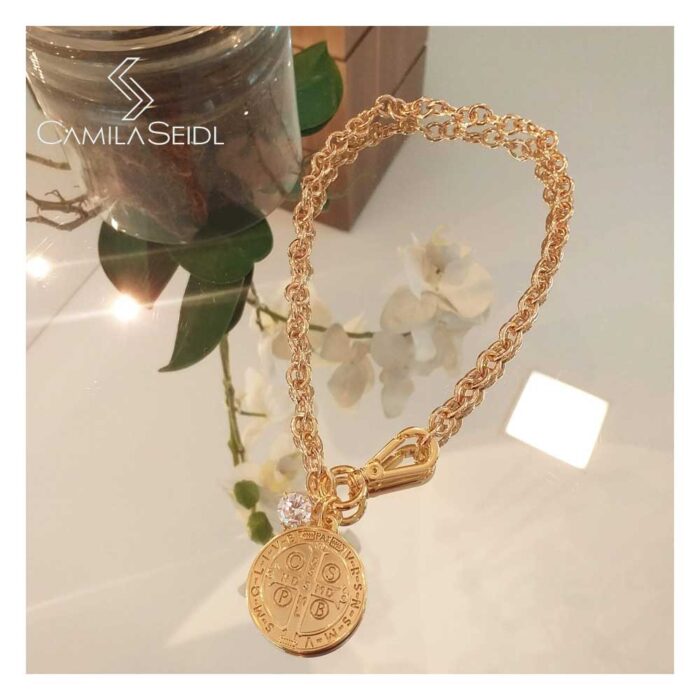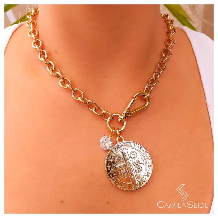 Colar de elos com fecho frontal, pingente de São Bento e zircônia de 10mm banhado em ouro 18k.