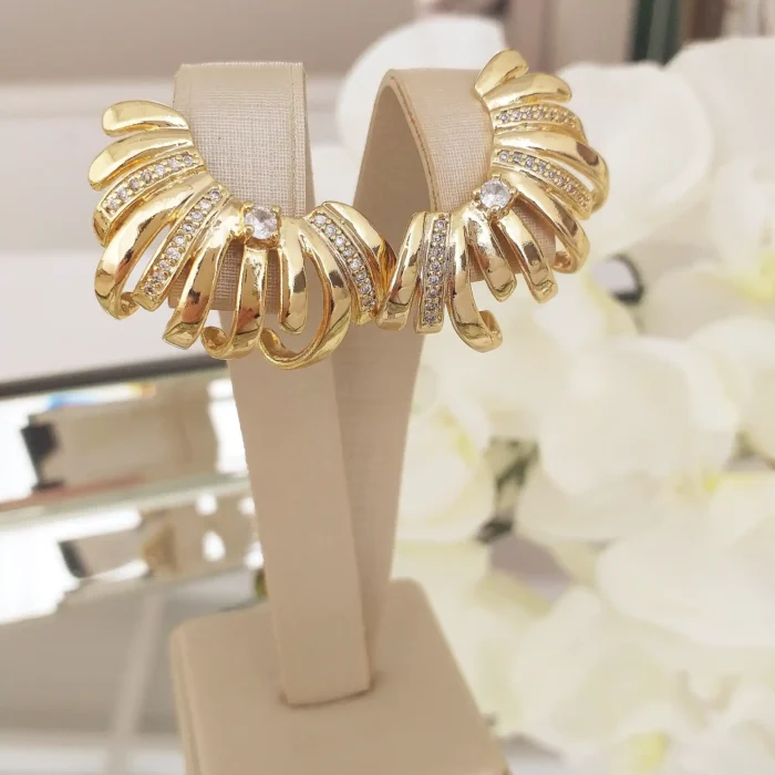 Maravilhoso brinco de linhas de metal e microcravejadas banhada em ouro 18k (2 de altura e 3,5 de largura)