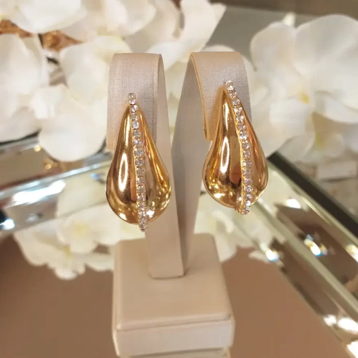 Maravilhoso brinco de gota de metal com uma linha central de zircônias.
