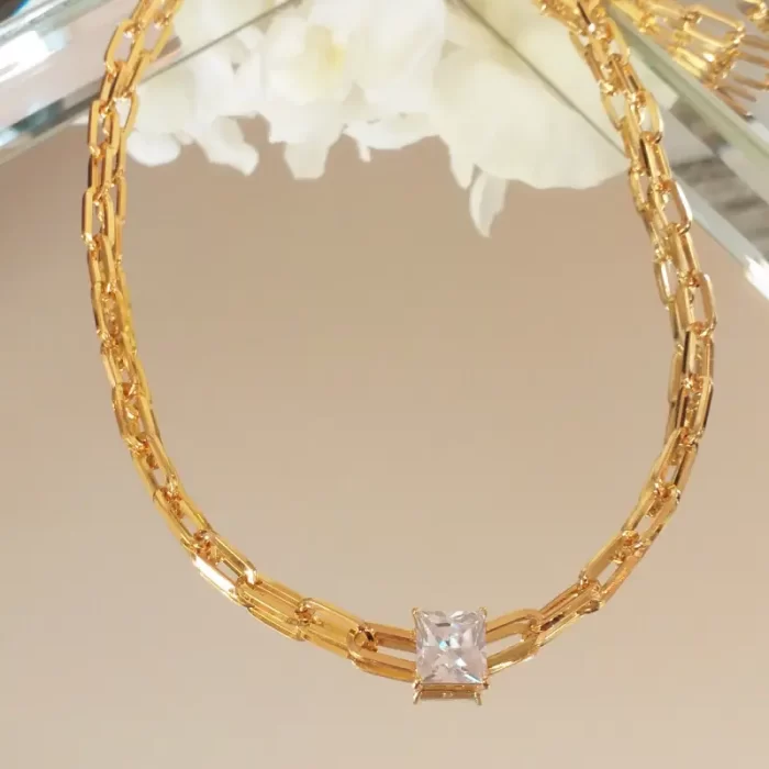 Colar de elos com pedra carré crystal. Tamanho 40 + 5 cm extensor (Peças banhadas em ouro 18k)