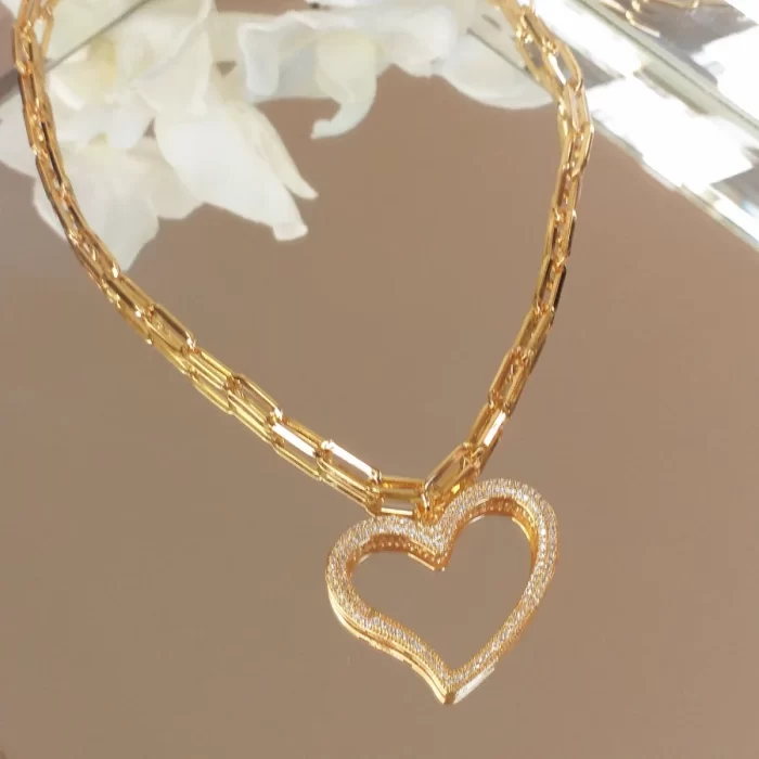 Belíssimo colar em elos com pingente de coração microcravejado.
