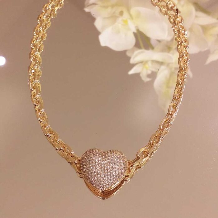 Colar de coração cheinho de microzircônias e corrente de elo (Tamanho: 40 cm + 5 extensor). Peça banhada em ouro 18k.