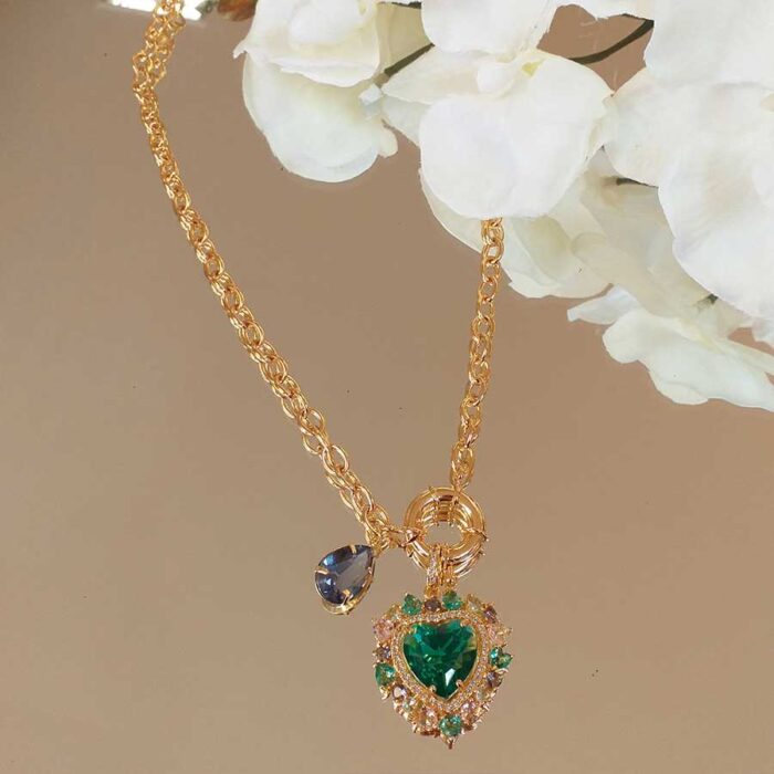 Colar coração turmalina, tanzanita e bóia. Peças banhadas em ouro 18k (45cm)