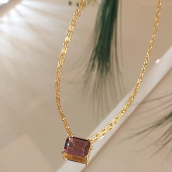 Colar de baguete ametista 10×14 na corrente ctr banhada em ouro 18k (45 + 5cm)