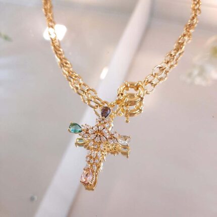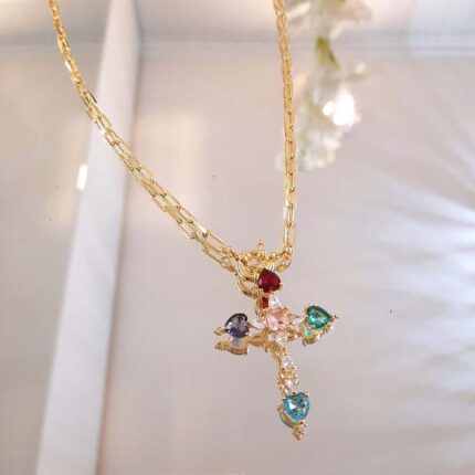 Colar com pingente de madrepérola de coração e zircônias coloridas. Peças banhadas em ouro 18k