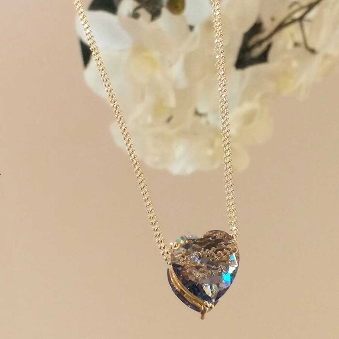 Colar com pingente de coração de zircônia tanzanita. Peças banhadas em ouro 18k (40 cm + 8 cm extensor)