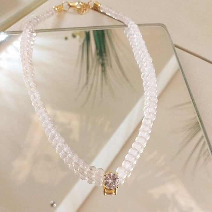 Colar de discos de quartzo rosa com pingente de bolinha de zircônia banhado em ouro 18 k (40 + 5 cm)