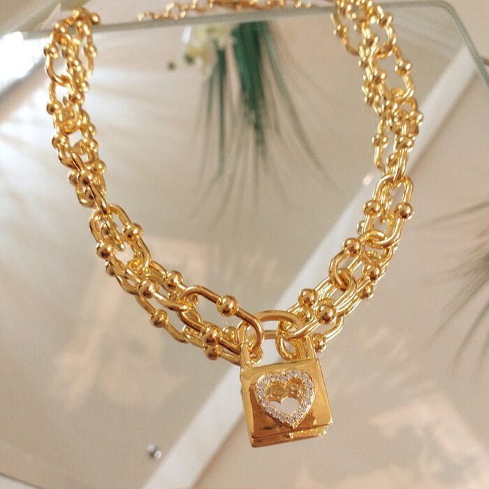 Colar de elos ovais com bolinha e cadeado com coração de zircônia banhado em ouro 18 k (40 + 5 cm)