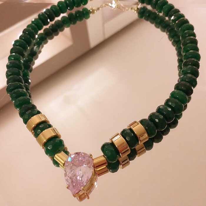 Colar jade facetada esmeraldacom gota de zircônia cristal e metais banhados em ouro 18k (40 + 5 cm extensor)