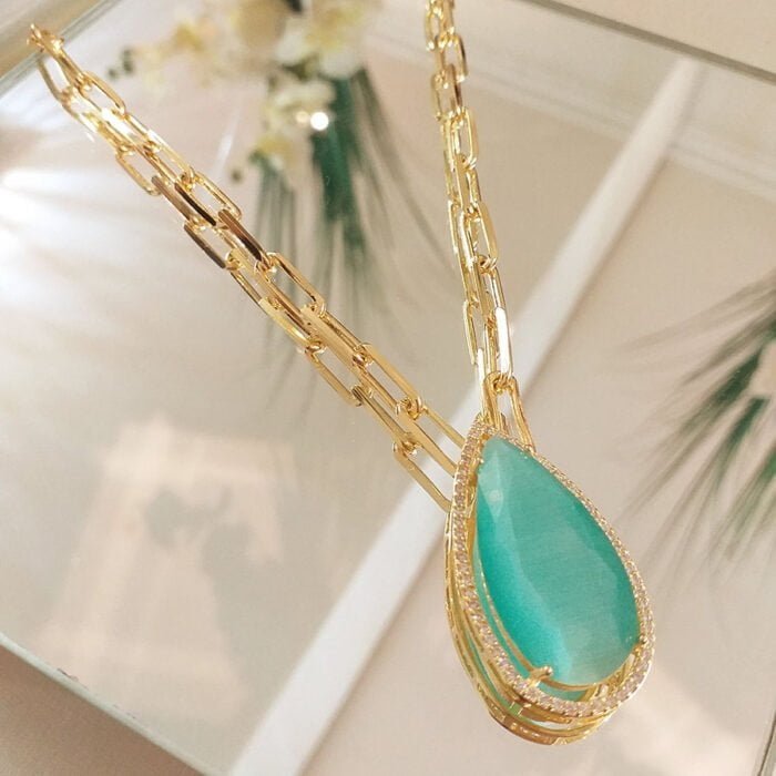 Colar de gota calcedônia com volta de zircônias no 15×30 banhada em ouro 18k (45 + 5cm)