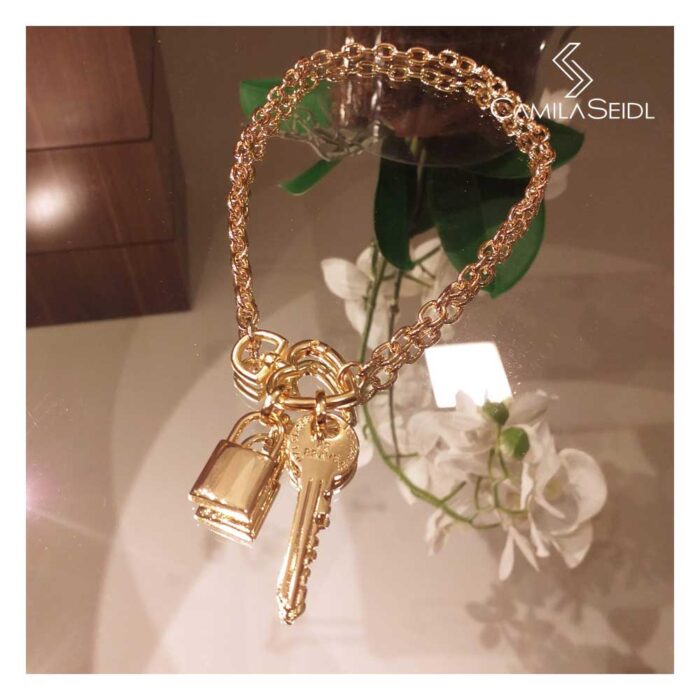Colar com mosquetão de coração médio, corrente elos médios, pingentes de chave e cadeado.
