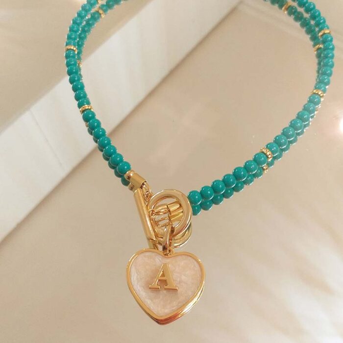 Colar de murano azul com pingente de coração e letra A banhados em ouro 18k