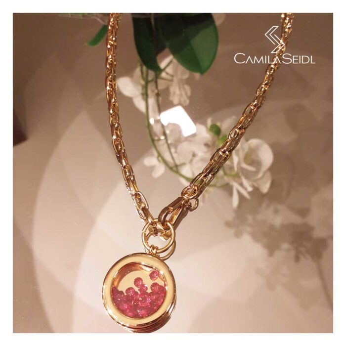 Colar relicário redondo com zircônias rubelita, corrente cartier média dourada.