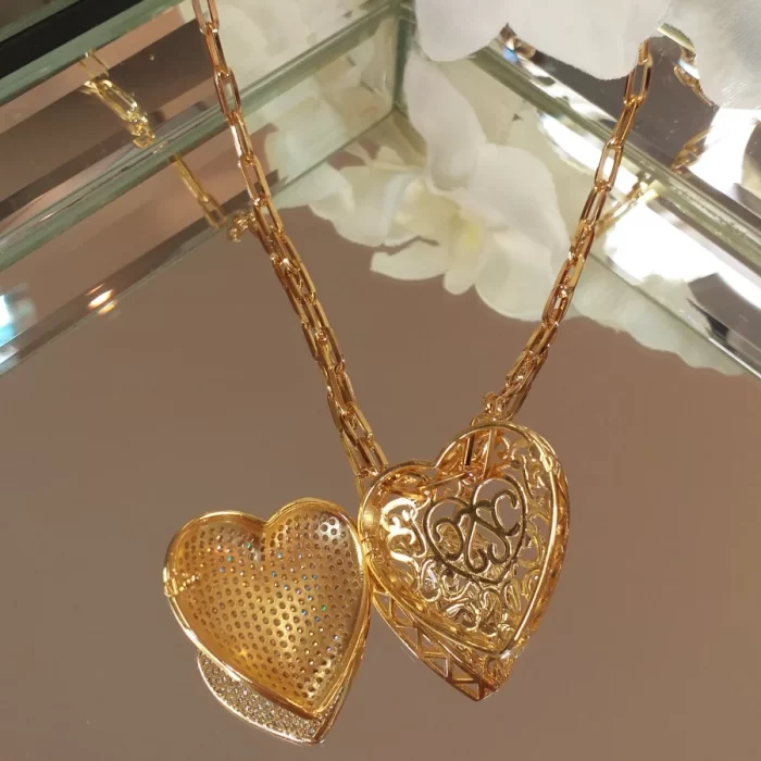 Colar relicário de coração microcravejado. Coração 3x3x1, e tamanho total 40 + 5 cm. Pecas banhadas em ouro 18K