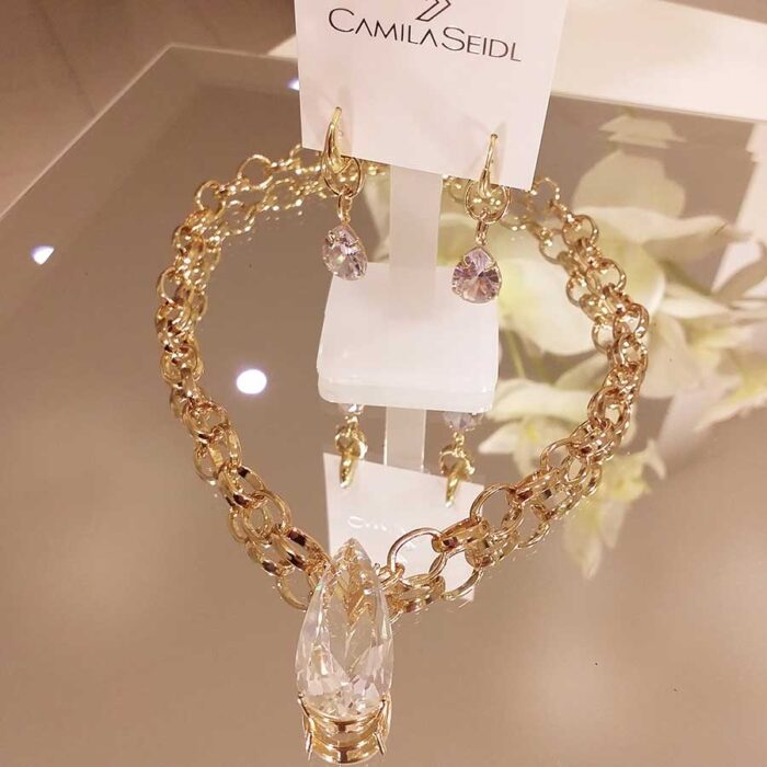 Conjunto de colar e brinco de gota com zircônia crystal.Peça banhada em ouro 18k.