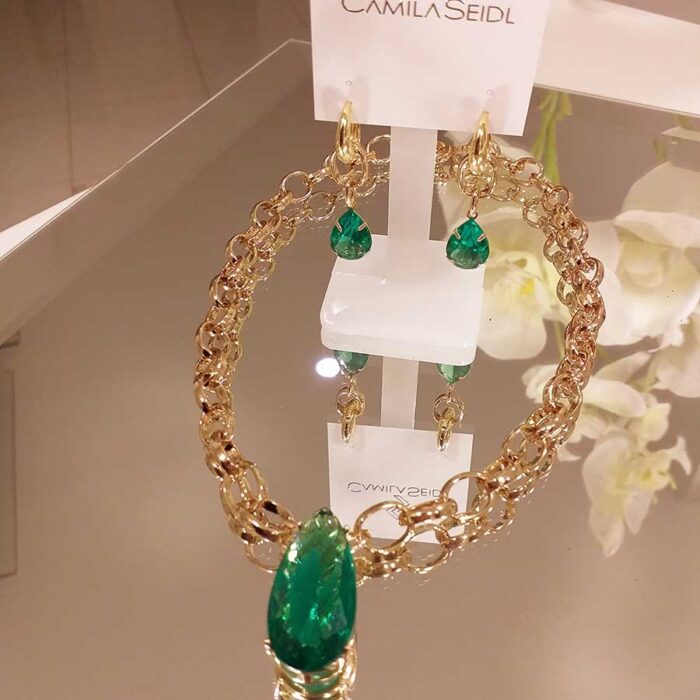 Conjunto de colar e brinco de gota com zircônia Turmalina.Peça banhada em ouro 18k.