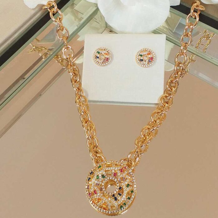 Conjunto de esfera cravejada com baguetes coloridas. Colar Ref. 3137 e Brinco Ref. 3174 (banhados em ouro 18k)