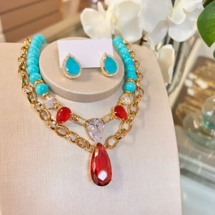 Colar turquesa com gota rubelita e cristal (40 + 5 cm)